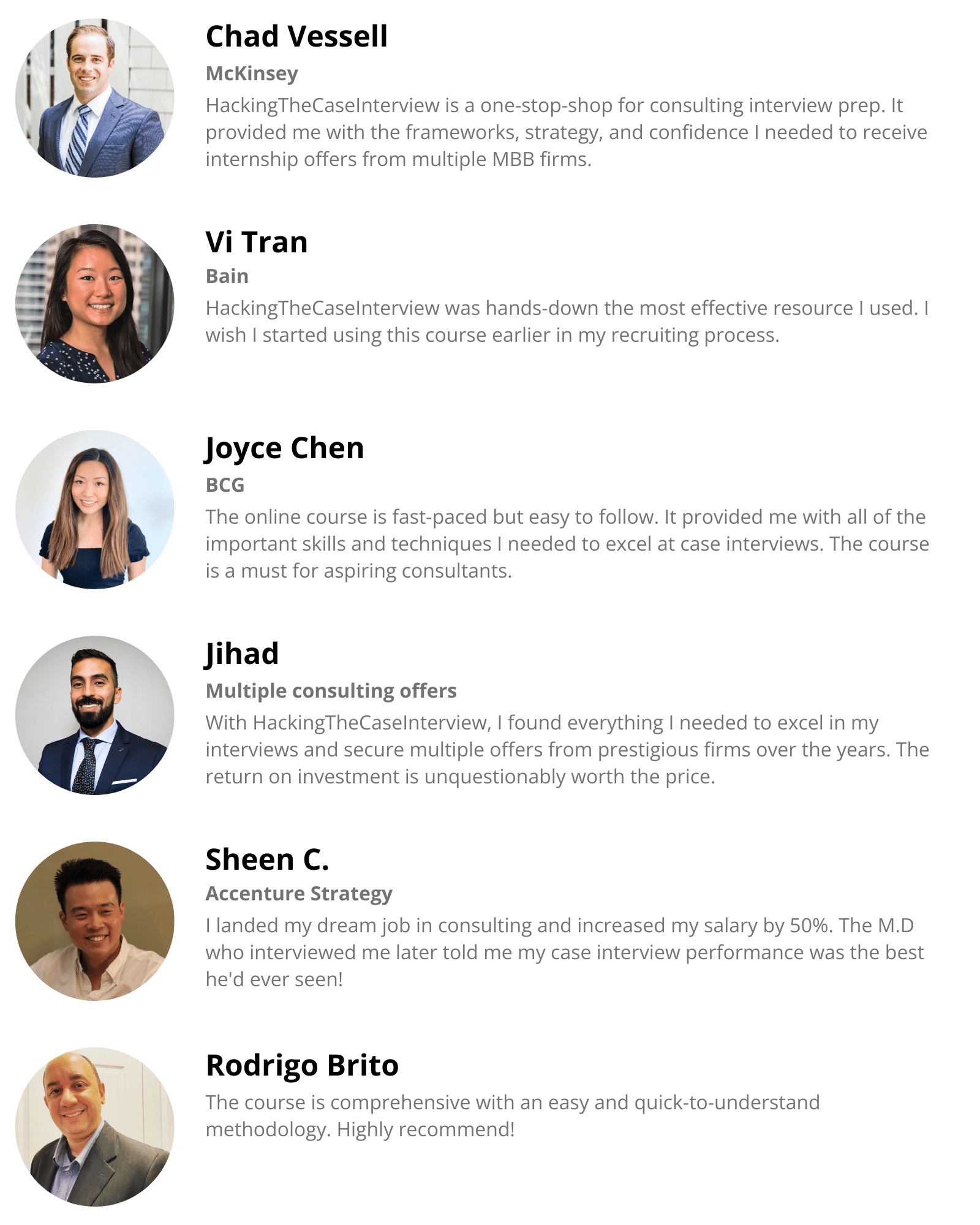 First, the course teaches the exact strategies I developed and used to land multiple consulting offers. These strategies are extremely robust and can be used in any case. They don't rely on pure memorization, but instead teach you how to think like a consultant.